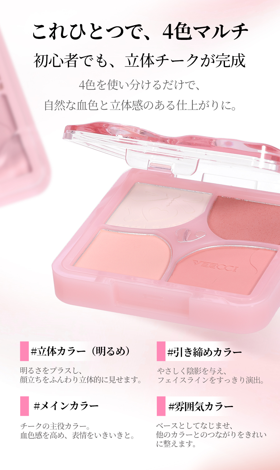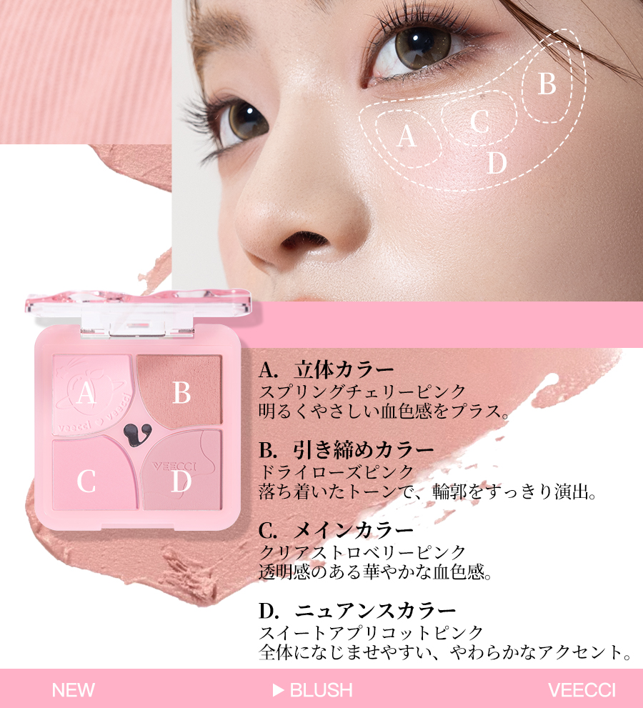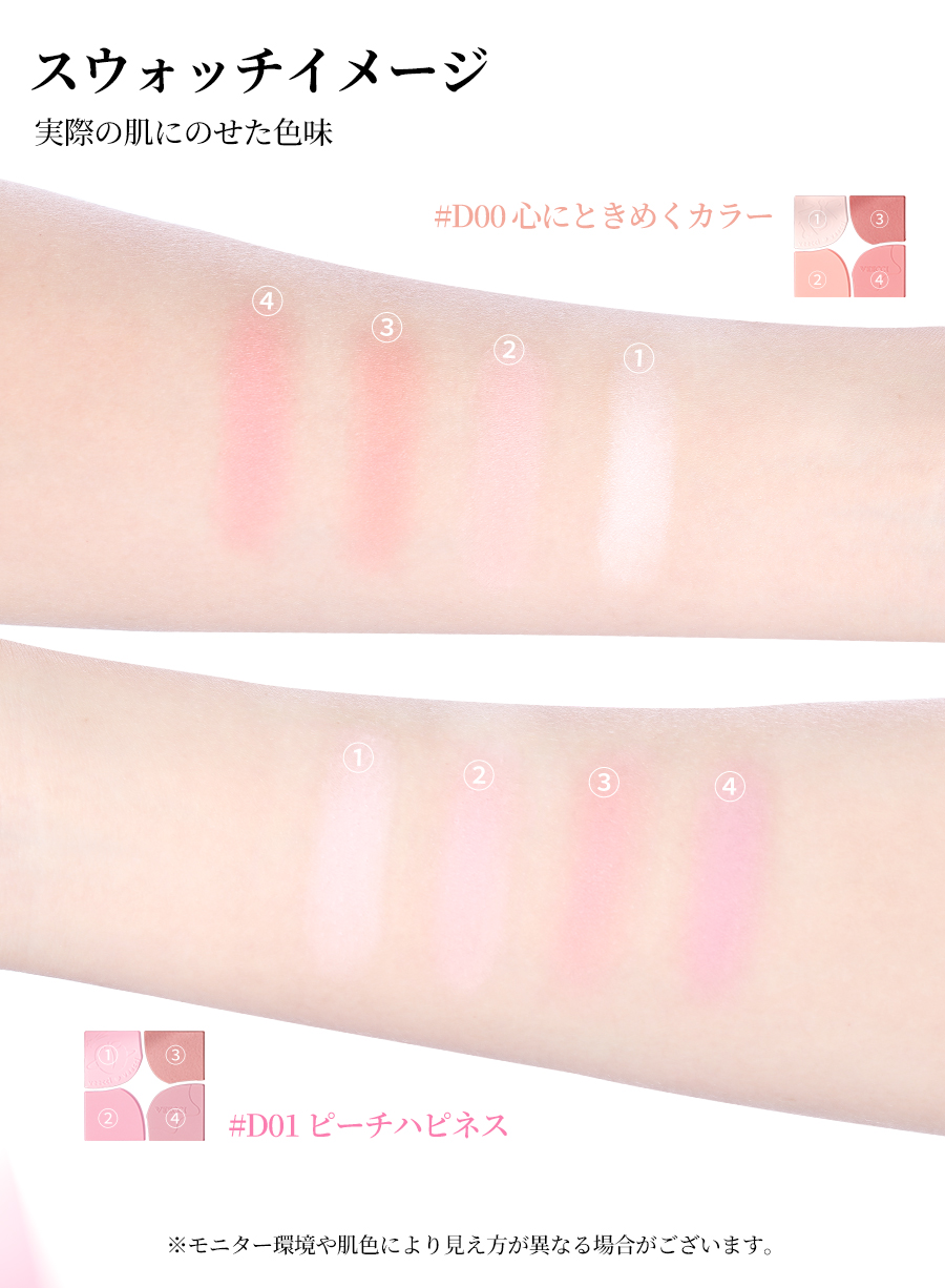 花咲くように色づく、4色チークパレット。重ねても厚塗り感が出にくく、透明感のある 立体フェイスに。細かく軽いテクスチャーで、粉感レス。 ふんわり柔らか、ソフトフォーカス仕上げ 肌に溶け込むようになじみ、白浮きせず、自然な仕上がりに。 先にクリームで血色感を仕込み、その上からパウダーを重ね ることで、自然でムラのない美しい発色を叶えます。