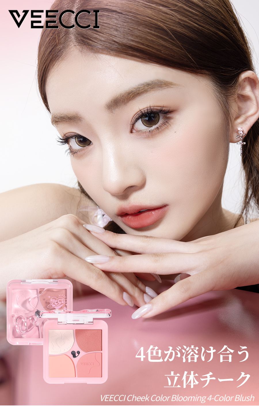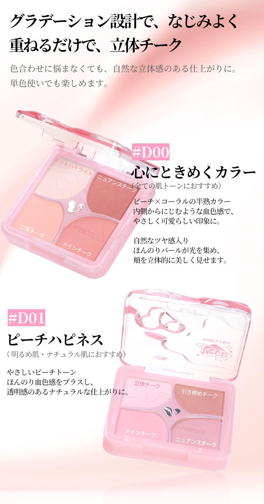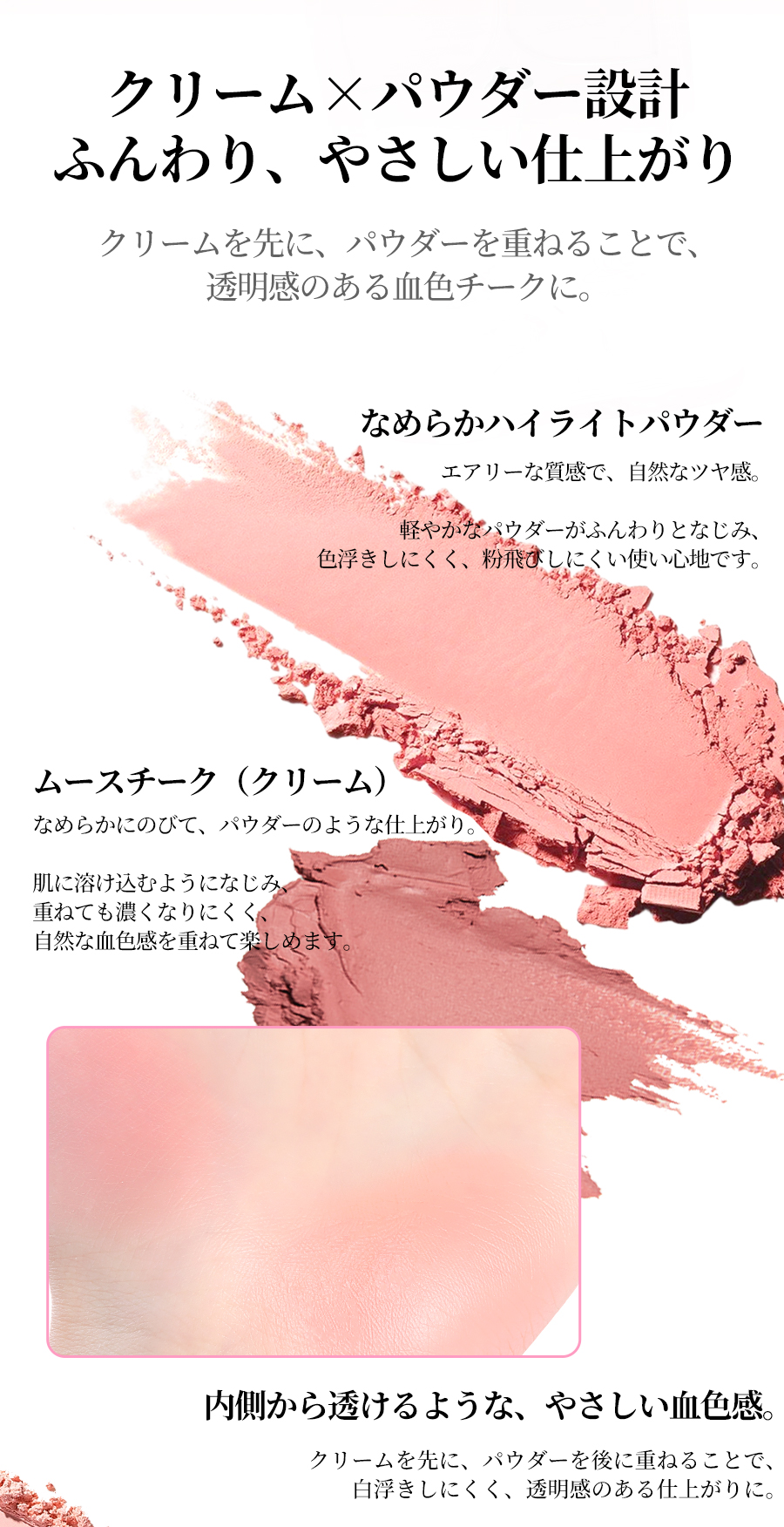 花咲くように色づく、4色チークパレット。重ねても厚塗り感が出にくく、透明感のある 立体フェイスに。細かく軽いテクスチャーで、粉感レス。 ふんわり柔らか、ソフトフォーカス仕上げ 肌に溶け込むようになじみ、白浮きせず、自然な仕上がりに。 先にクリームで血色感を仕込み、その上からパウダーを重ね ることで、自然でムラのない美しい発色を叶えます。