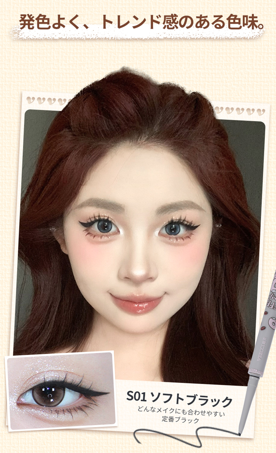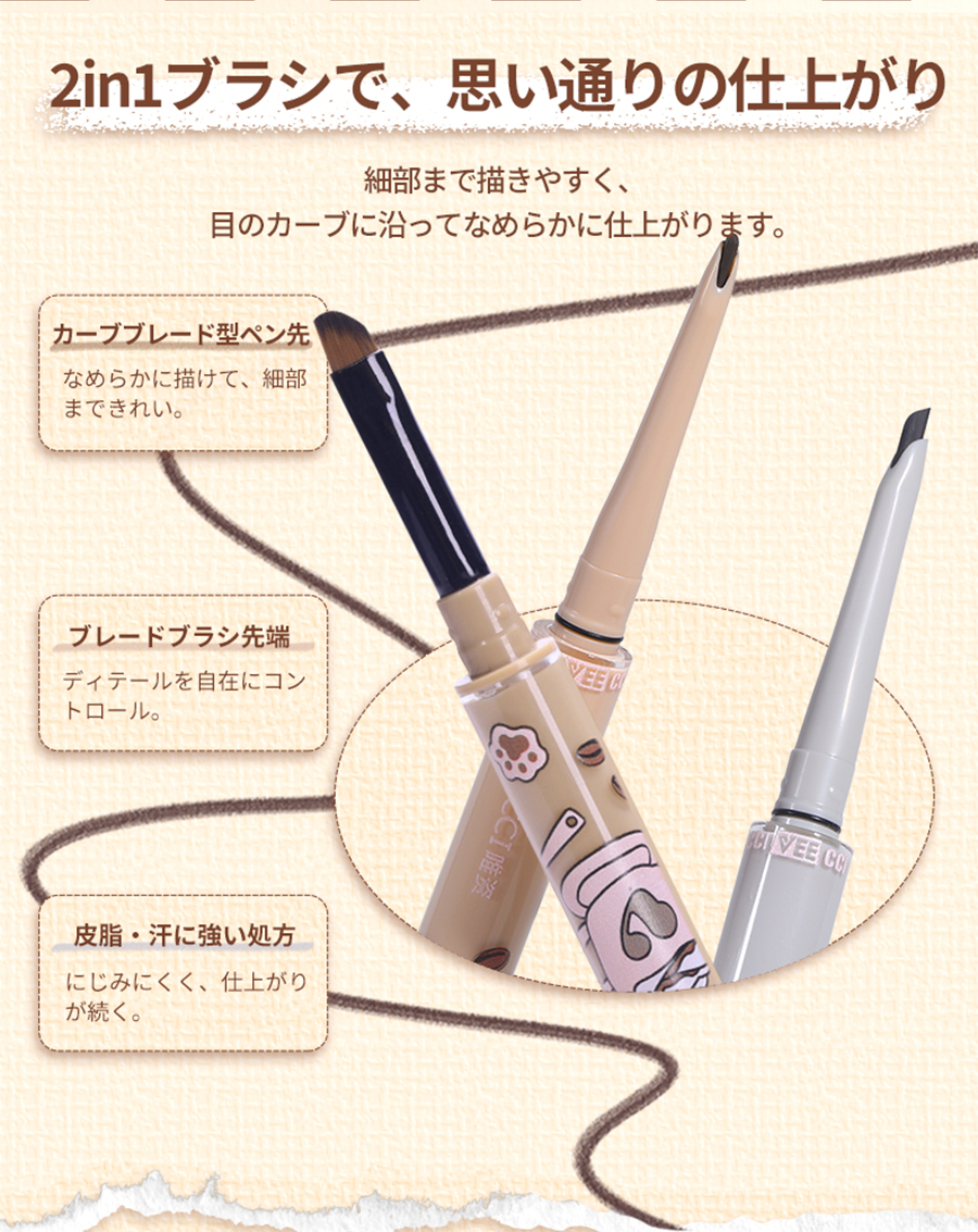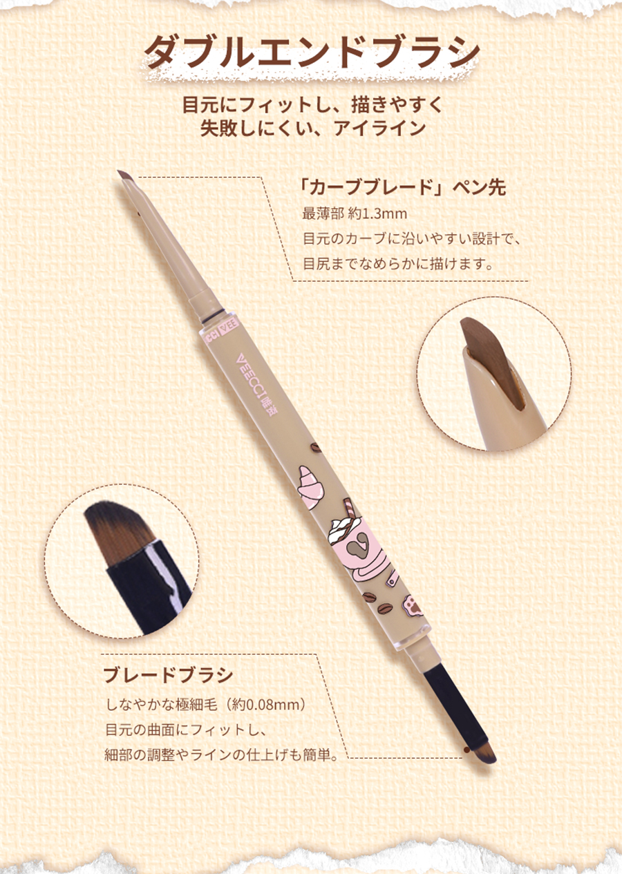 ペンシル×ブラシ1本で完成 テクいらずで美しいアイメイクに ペンシルのもっとも広い面でわずか1.3mm!弦月のようなカーブでまぶたをしっかりフィット 細くとがったラインでアイメイクの跳ね上げも自由自在 ブラシ部分は毛先0.08mmの弾力ブラシはまぶたの曲線にフィットすうるようカーブ上に。 狙った部分にピンポイントに描け、軽やかなラインに。