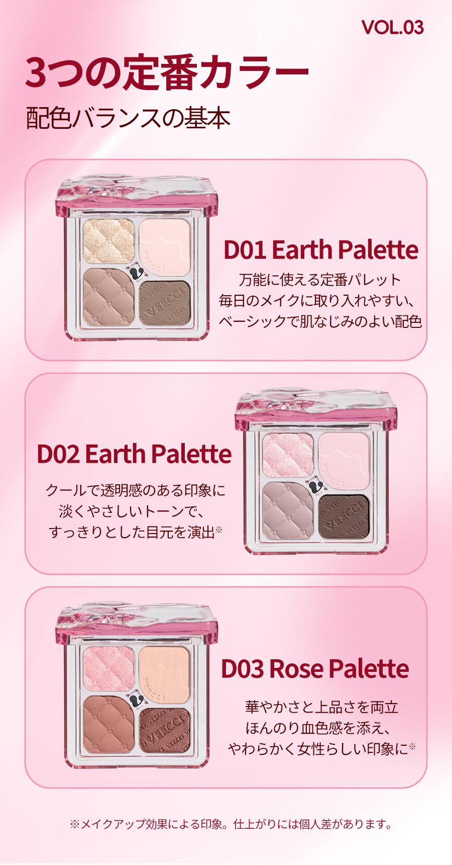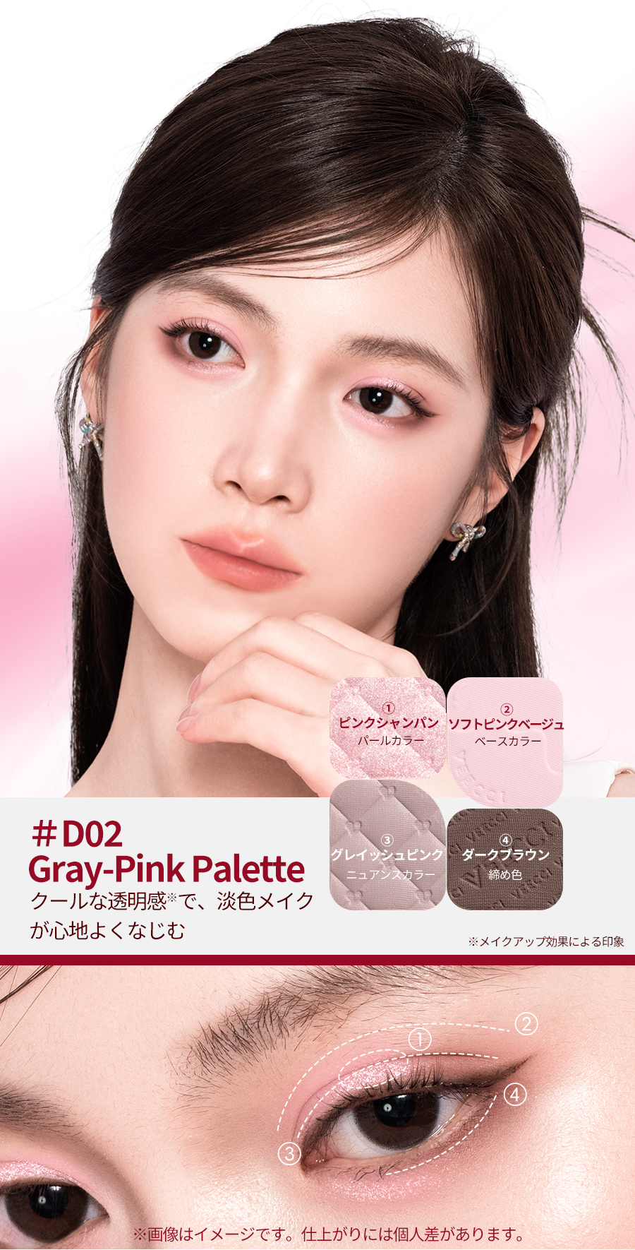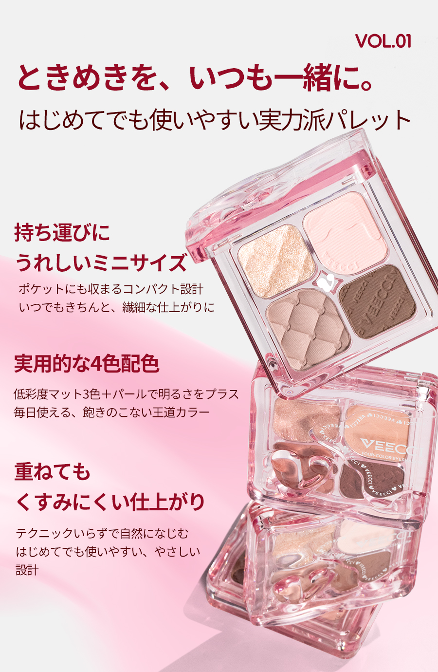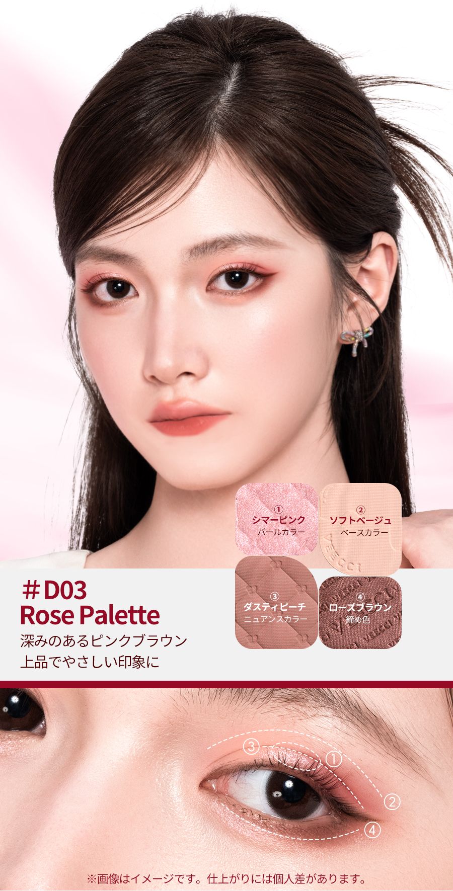 落ち着いたクラシックカラーを組み合わせた、4色アイシャドウパレット。 単色使いはもちろん、重ねてもにごりにくく、自然なグラデーションが簡単に完成します。 肌なじみの良いカラー設計で、目元に上品な陰影と立体感をプラス。 オン・オフ問わず使いやすく、毎日のメイクに取り入れやすい万能パレットです。 ナチュラルからきちんと感のある仕上がりまで、シーンに合わせた表情を楽しめます。