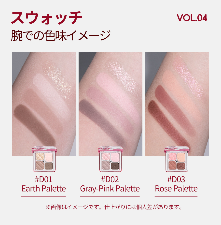 落ち着いたクラシックカラーを組み合わせた、4色アイシャドウパレット。 単色使いはもちろん、重ねてもにごりにくく、自然なグラデーションが簡単に完成します。 肌なじみの良いカラー設計で、目元に上品な陰影と立体感をプラス。 オン・オフ問わず使いやすく、毎日のメイクに取り入れやすい万能パレットです。 ナチュラルからきちんと感のある仕上がりまで、シーンに合わせた表情を楽しめます。