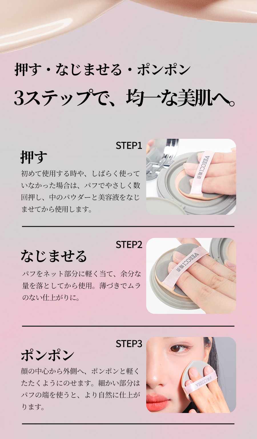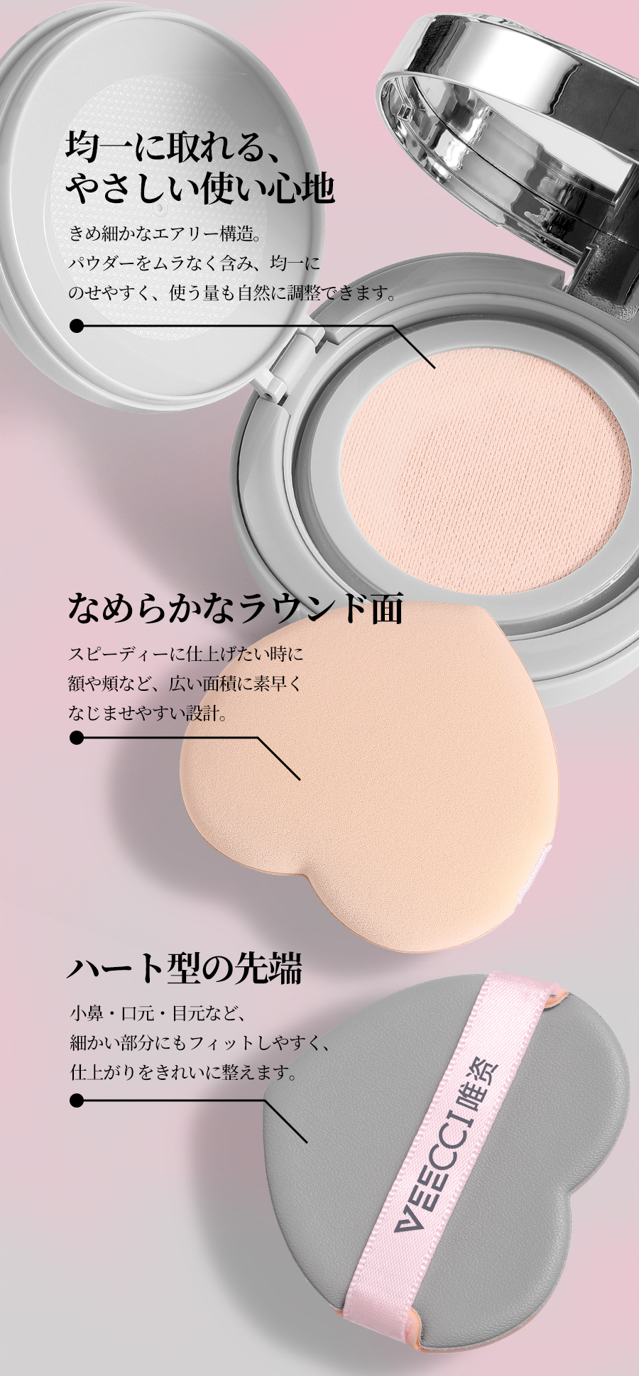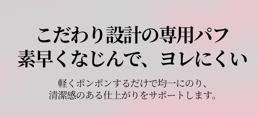 ”軽やかに密着・崩れにくい、毎日使えるフレッシュクッション。”軽やかでみずみずしい仕上がりの クッションファンデーション。肌にふわっと密着し、ムラなく均一にカバーしながら、透明感のある素肌感を演出します。軽いテクスチャーで重くならず、日常のメイクにぴったり。ケースひとつで手早くベースが完成するので、忙しい朝やお直しにも最適です。肌本来の質感を生かしつつ、自然なツヤとフレッシュな印象をキープ。デイリーに使えるカジュアルなベースメイクとしておすすめのアイテムです。