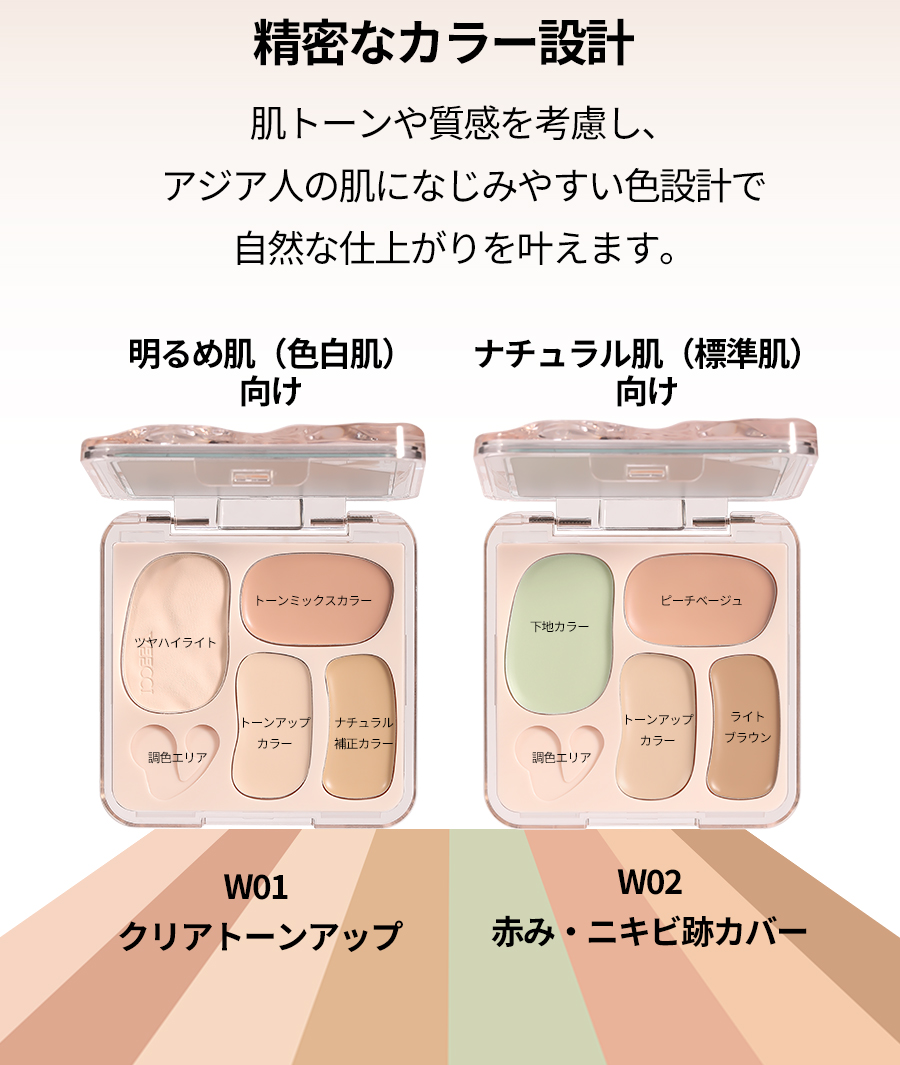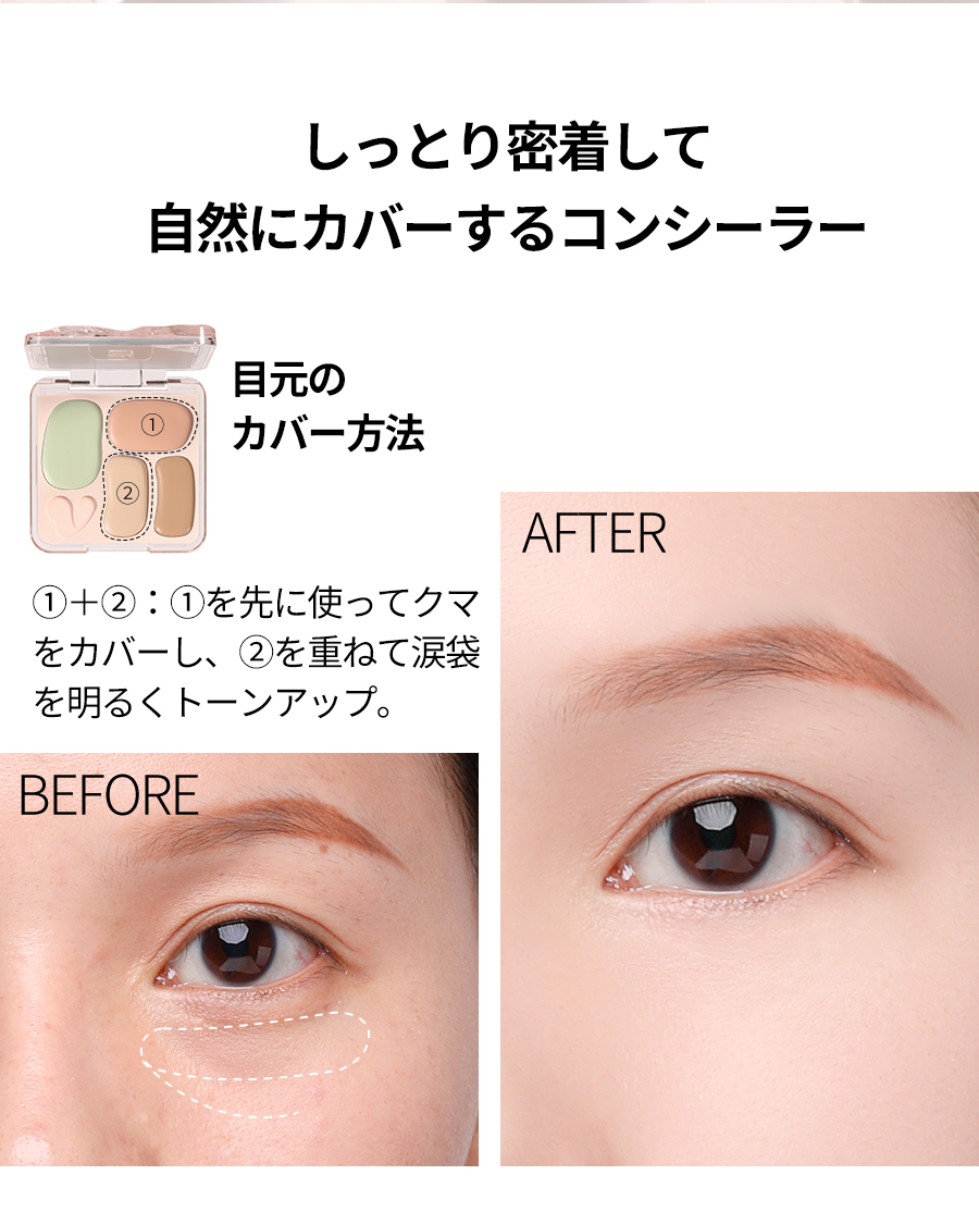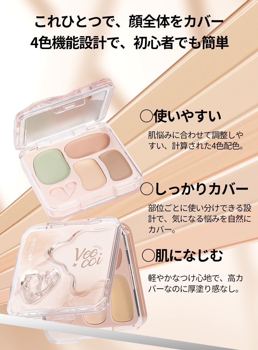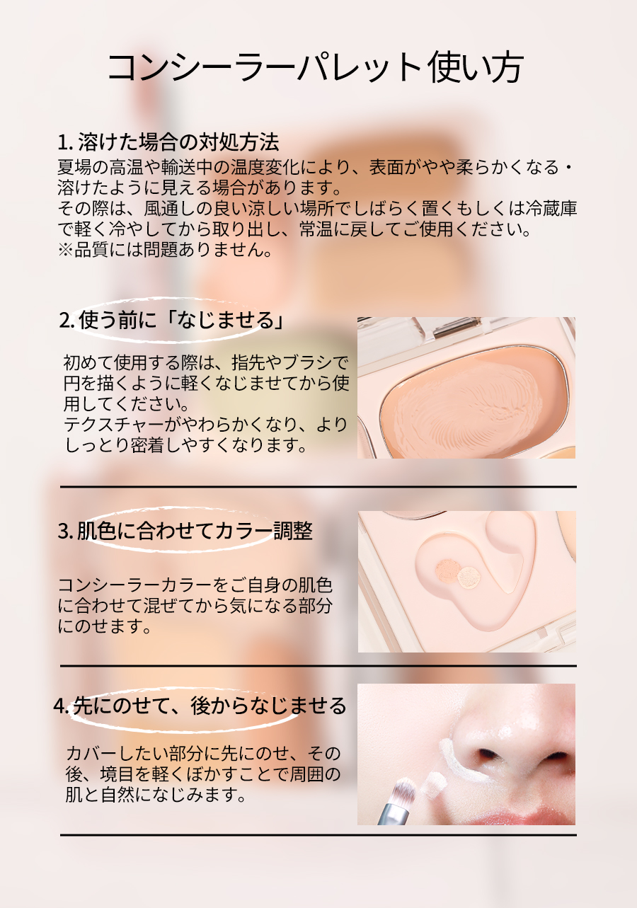 『ひと塗りで、魅せる肌へ』 なりたい肌、叶えるカバー力とナチュラルな仕上がり プロフェッショナルのメイク技 術を自宅で再現できる、万能コ ンシーラーパレットが登場。赤 み、クマ、シミ、くすみ、毛穴 …あらゆる肌悩みをこれ1つで カバー。軽やかなテクスチャー で肌にぴったりフィットし、厚 塗り感ゼロの自然な仕上がりを 実現します。