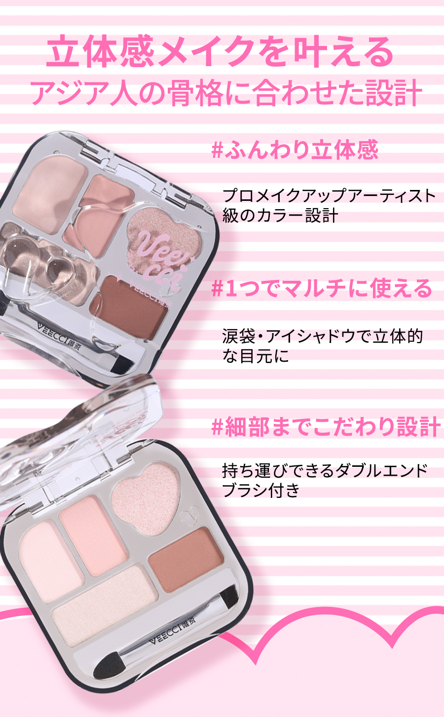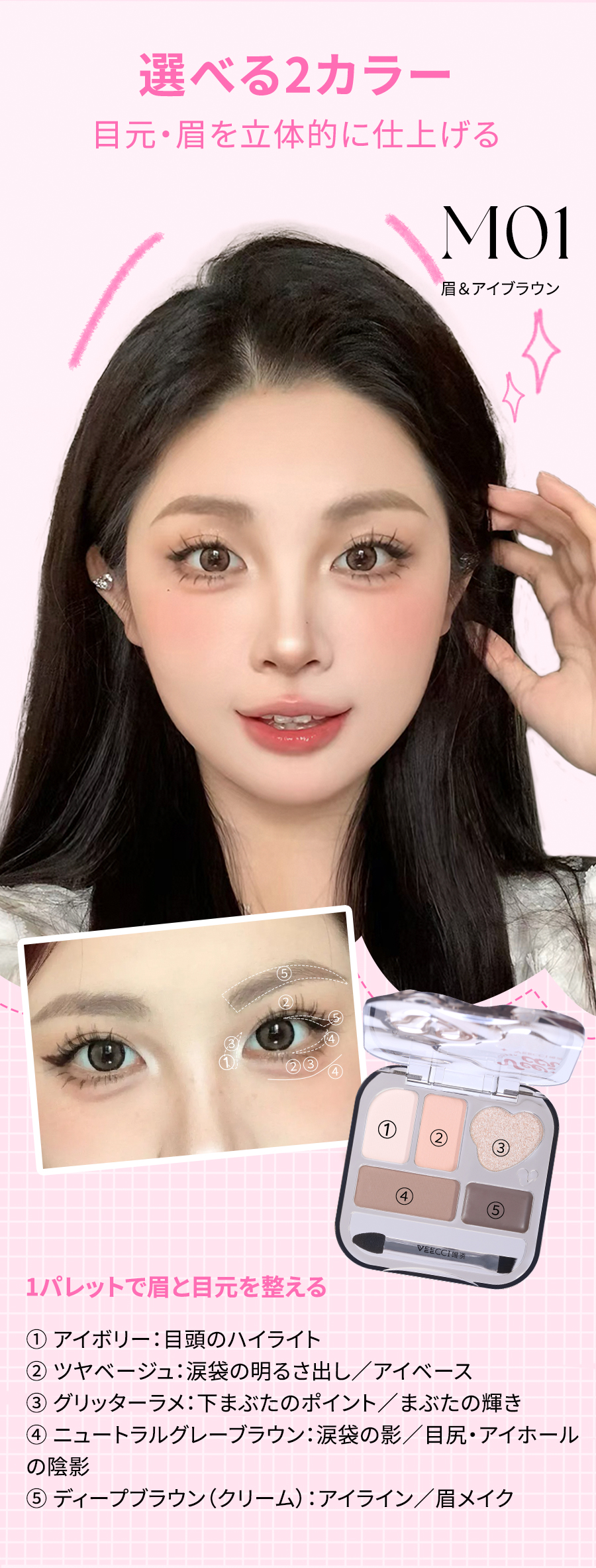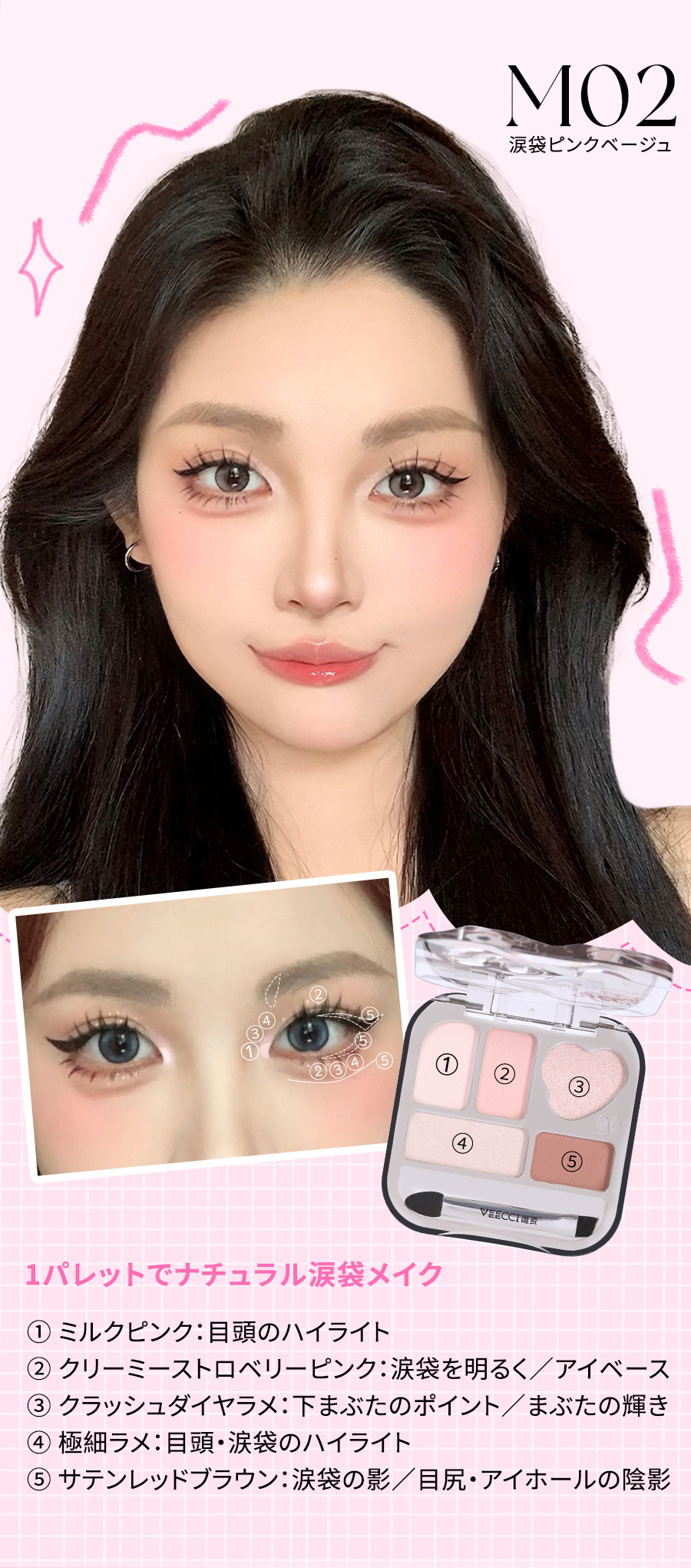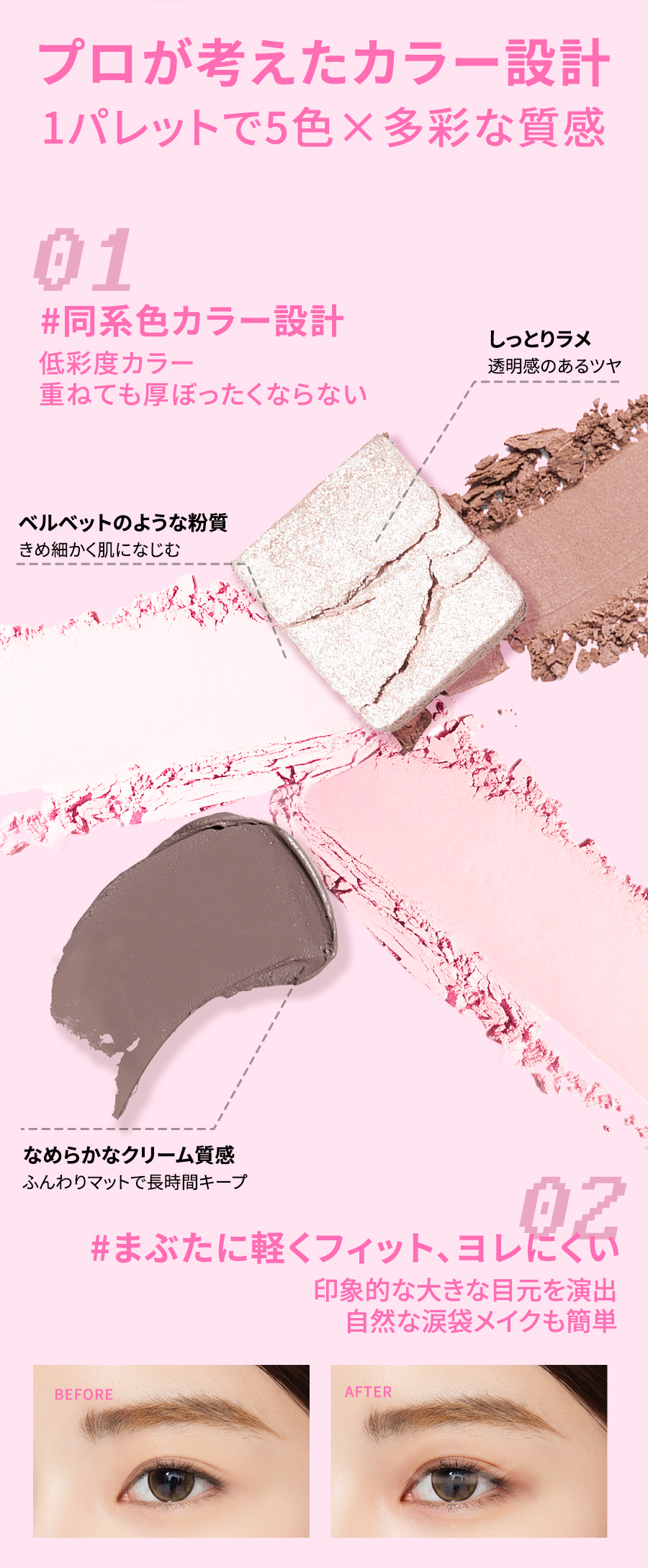 涙袋メイクを手軽に楽しめる、マルチタイプのアイパレット。 肌なじみの良いカラーときらめきカラーを組み合わせることで、自然な陰影と立体感のある目元を演出します。 やわらかなテクスチャーでまぶたや目元になじみやすく、ナチュラルな涙袋メイクが完成。 単色でも組み合わせても使えるため、日常メイクから華やかなアイメイクまで幅広く楽しめます。 ※メイクアップ効果による印象。仕上がりには個人差があります。